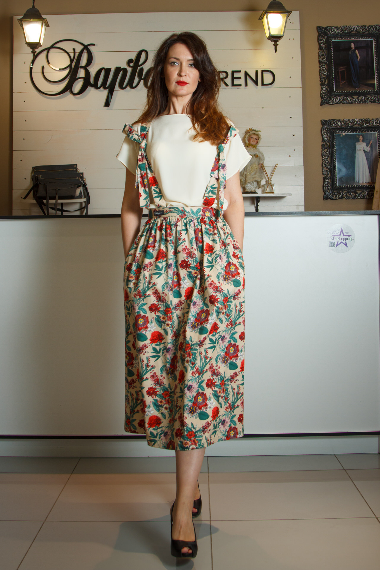 Юбка на лямках, из хлопка - стрейч, с цветочным принтом, длина - миди